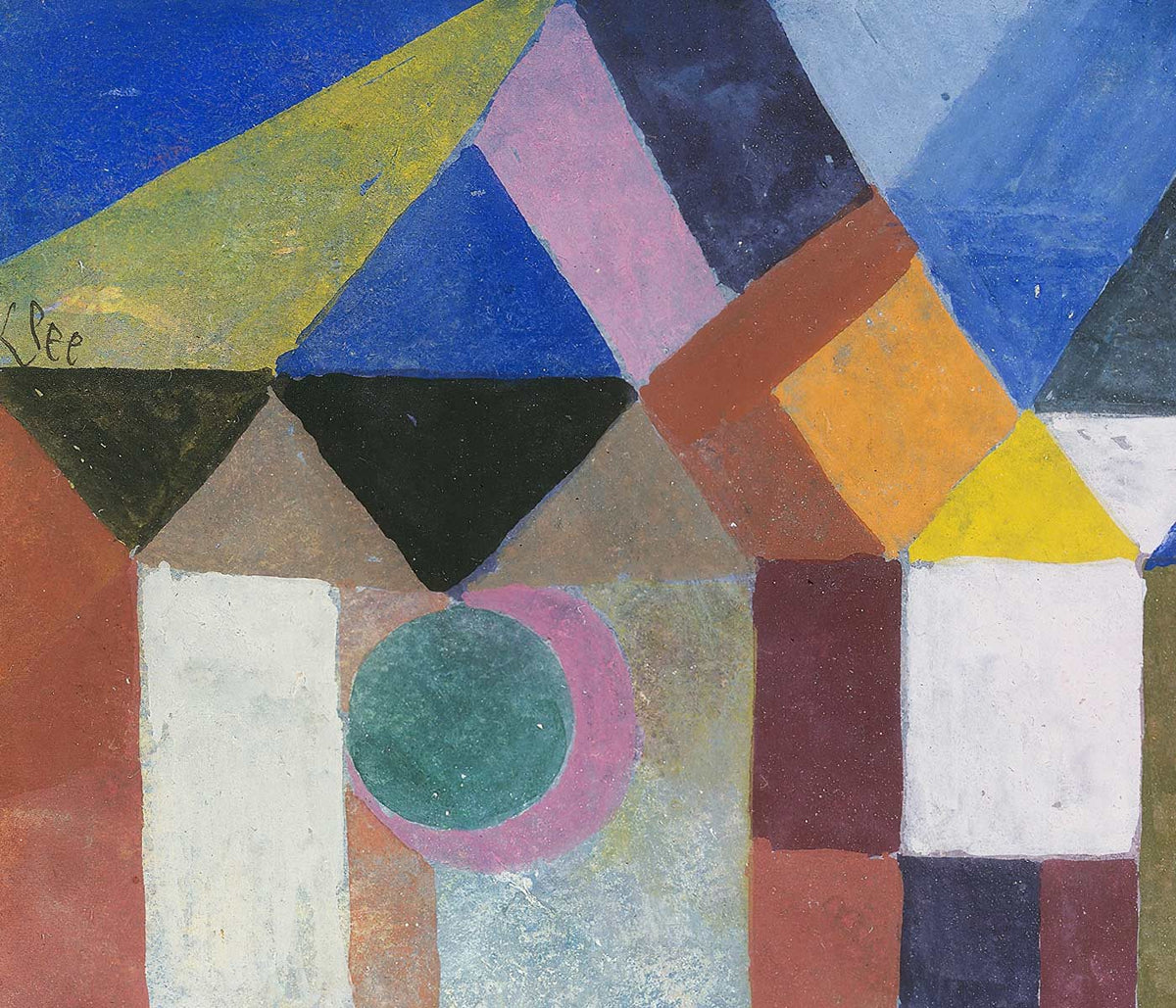 Paul Klee · 1922 · Geometric village art print with three stylized houses in soft green, blue, and pink